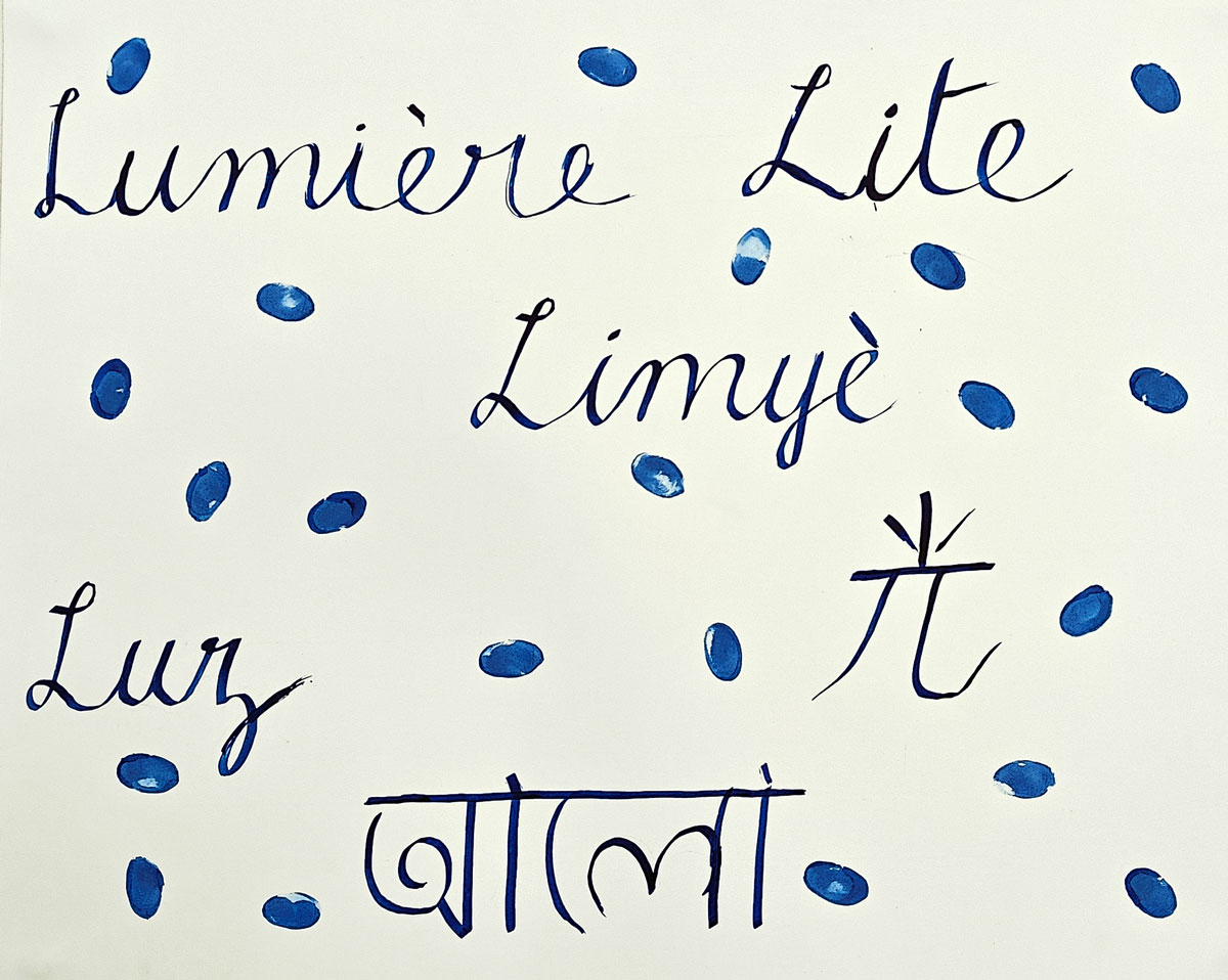 I started by searching for the word ”Light” in every language of all my origins. I chose the word light because my name, Lucie, means light in Latin. I found all of the terms. Then I started training to do every letter in calligraphy. Then I trained to make it better. I chose the placement of each word. After that, I decided to add my fingerprint because the word represents myself with all my origins, with the different language, my fingerprint representing my identity, so both my name and my origins. I used the same ink as the calligraphy.